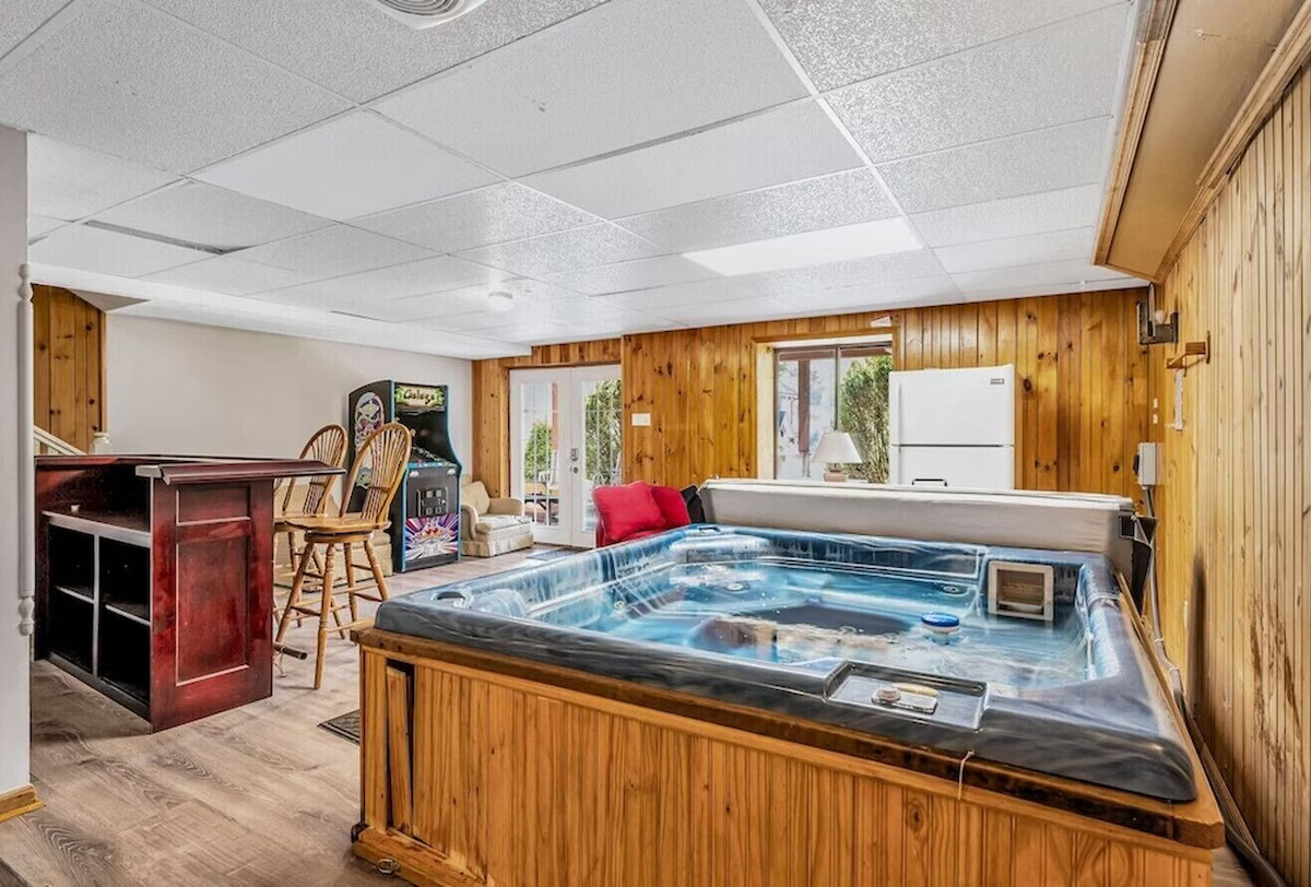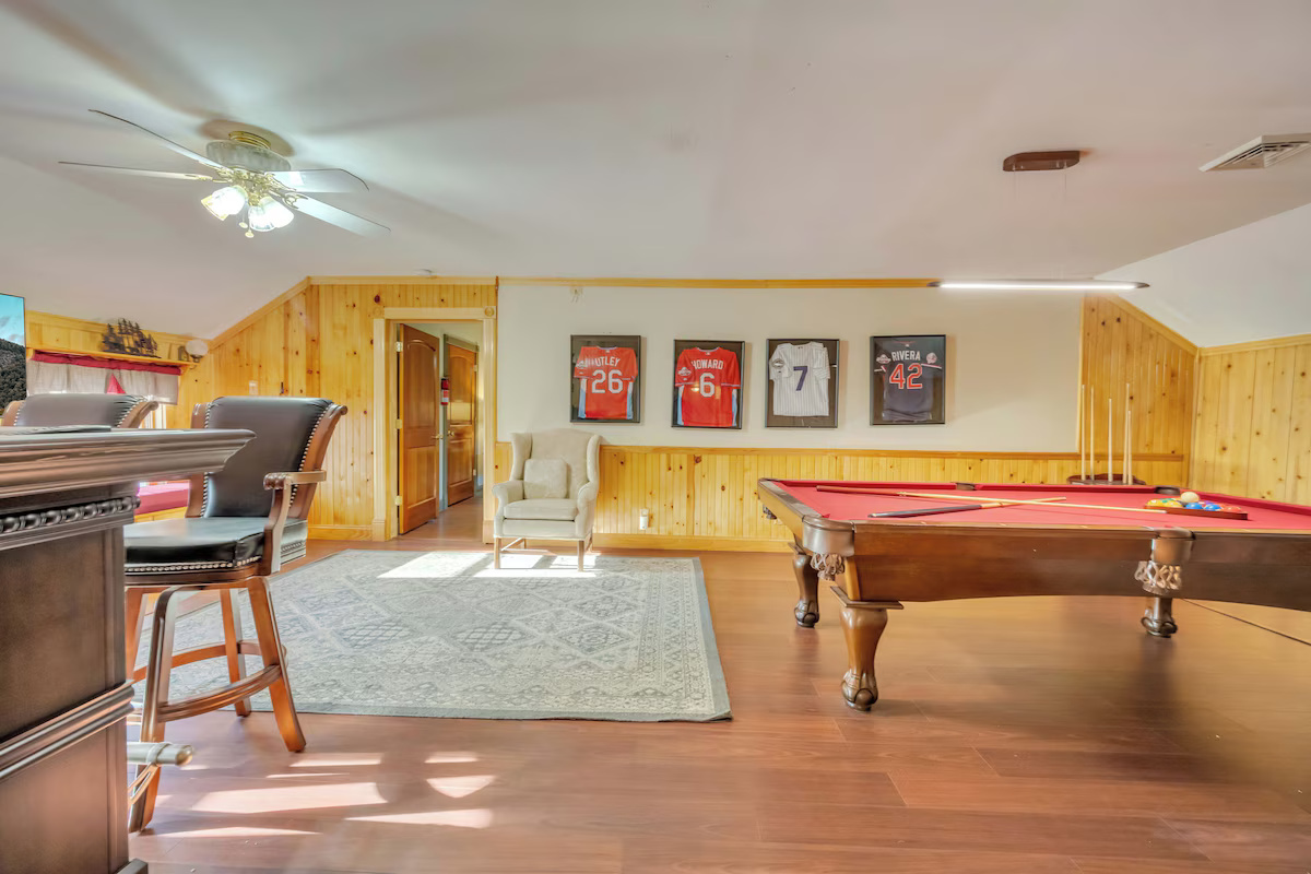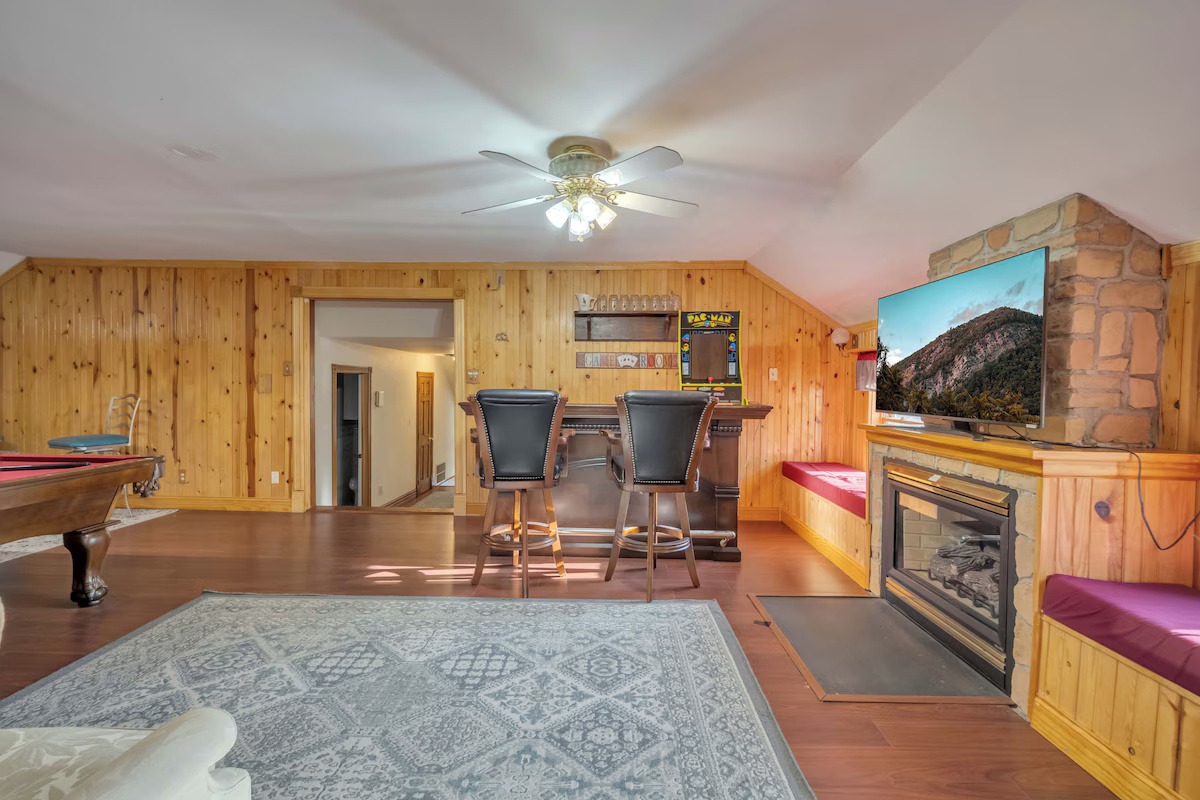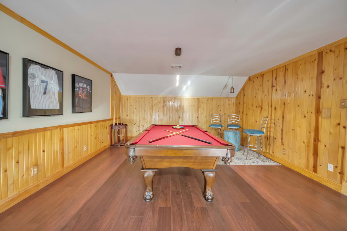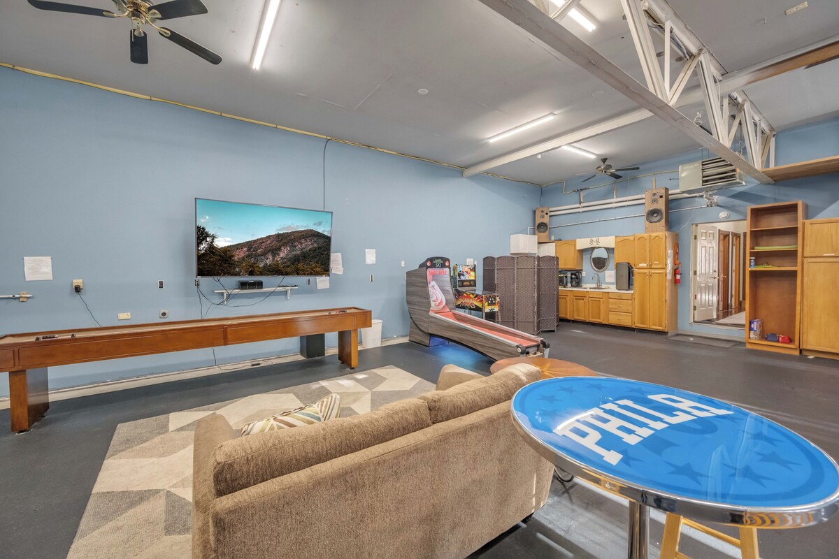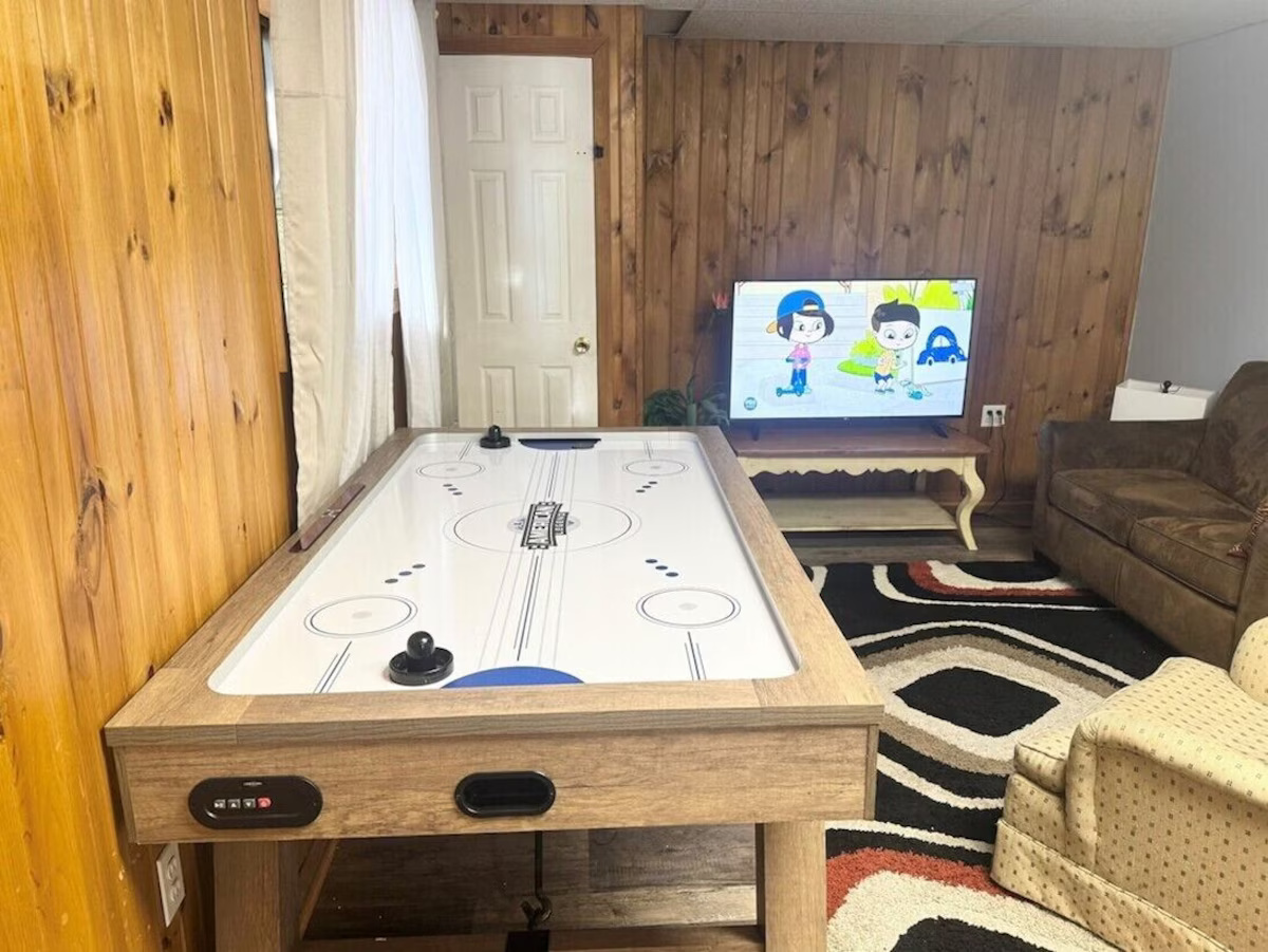 1350sqft Game Room in Main White House with Skee Ball, Ping Pong, Shuffleboard, Pop-a-Shot Basketball, Digital Pinball. Also has a Sauna, Treadmill, Stairmaster, Weight System, 85″ TV.