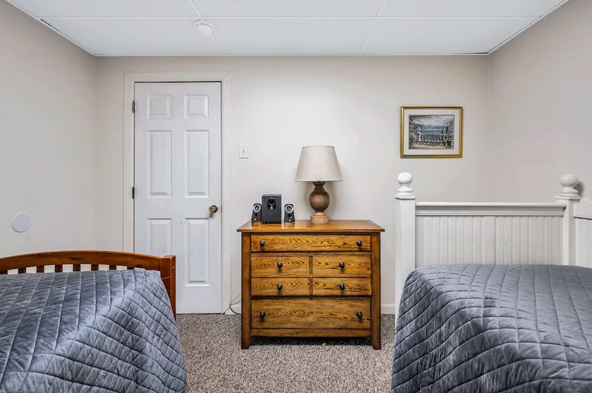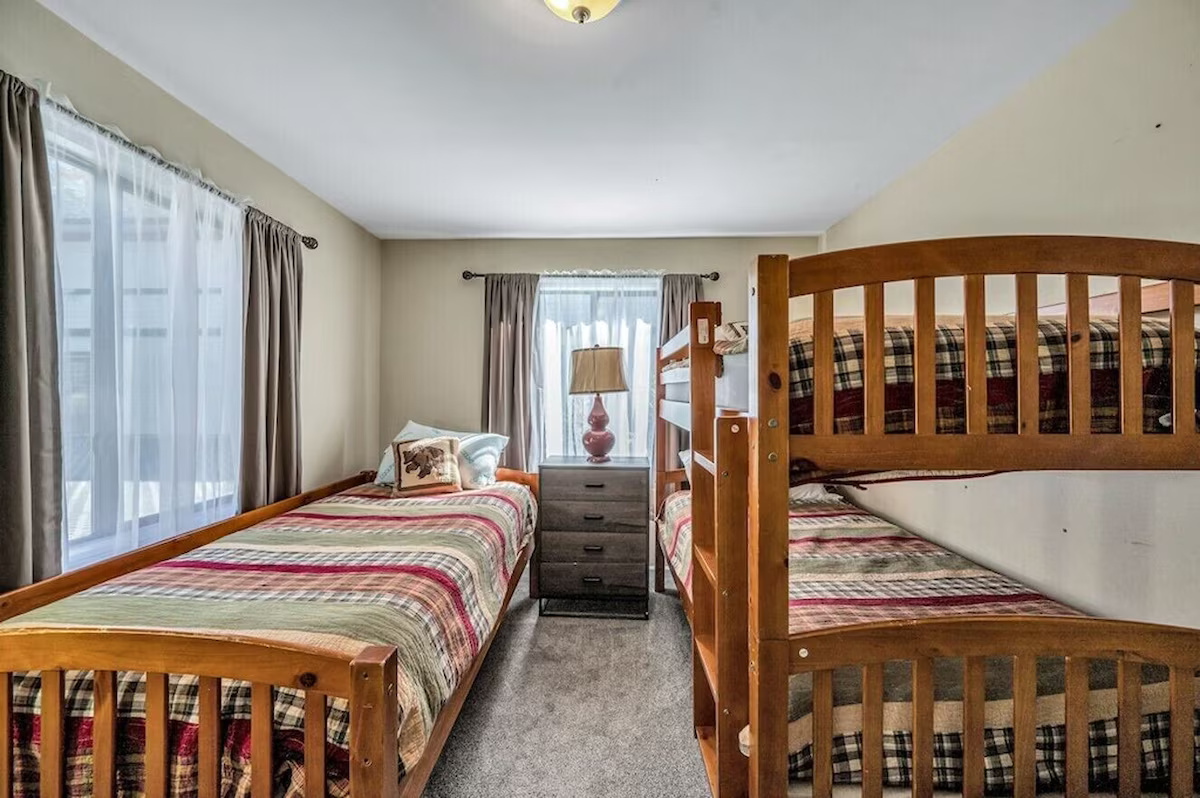 Two bedrooms on the lower level and two upstairs. Lower level has one with a queen, and one bedroom with a twin/single and a bunk bed. Two bedrooms upstairs. One bedroom with 2 twin/single beds, and one with a queen
